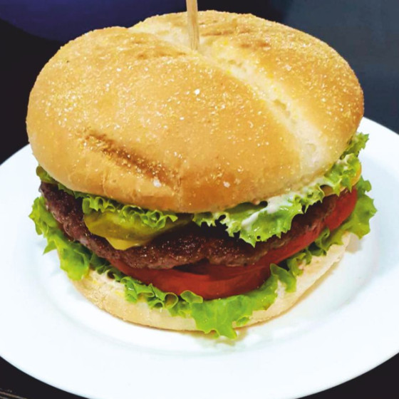 Состав: домашняя булочка, сыр моцарелла, котлета из мраморной говядины, маринованные огурчики, маринованный лук, листья салата, фирменный соус.