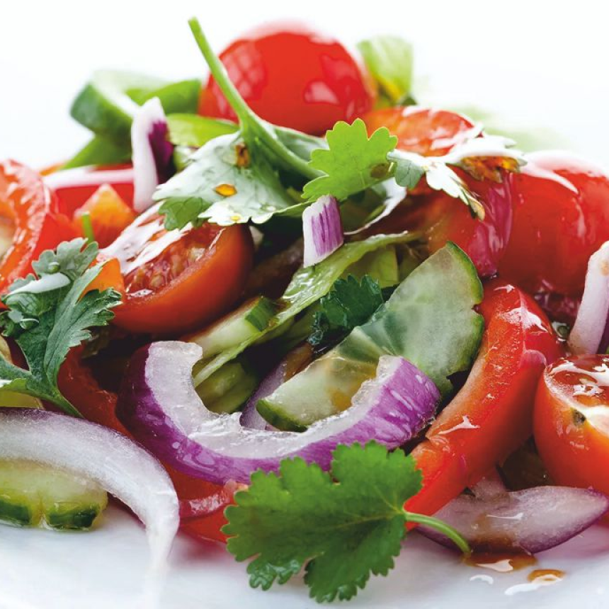Состав: свежие помидор, огурец, перец болгарский, лук репчатый, листья салата, чеснок, масло растительное.