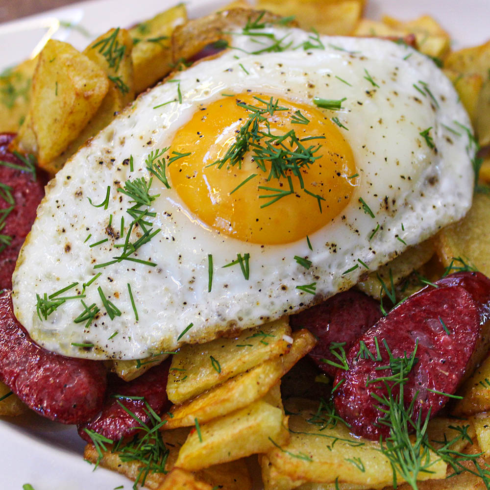 Состав: картофель жареный, колбаски охотничьи, специи, лук, яйцо глазунья.